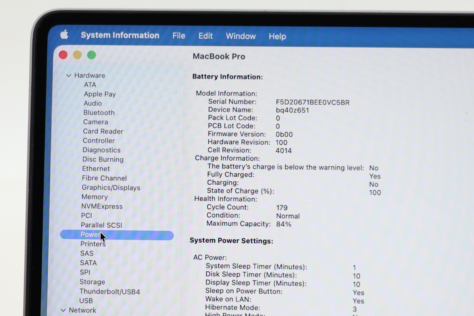 The battery health is currently at 84%, with 179 charge cycles completed. This is considered a decent level for its age and ensures reliable daily performance.