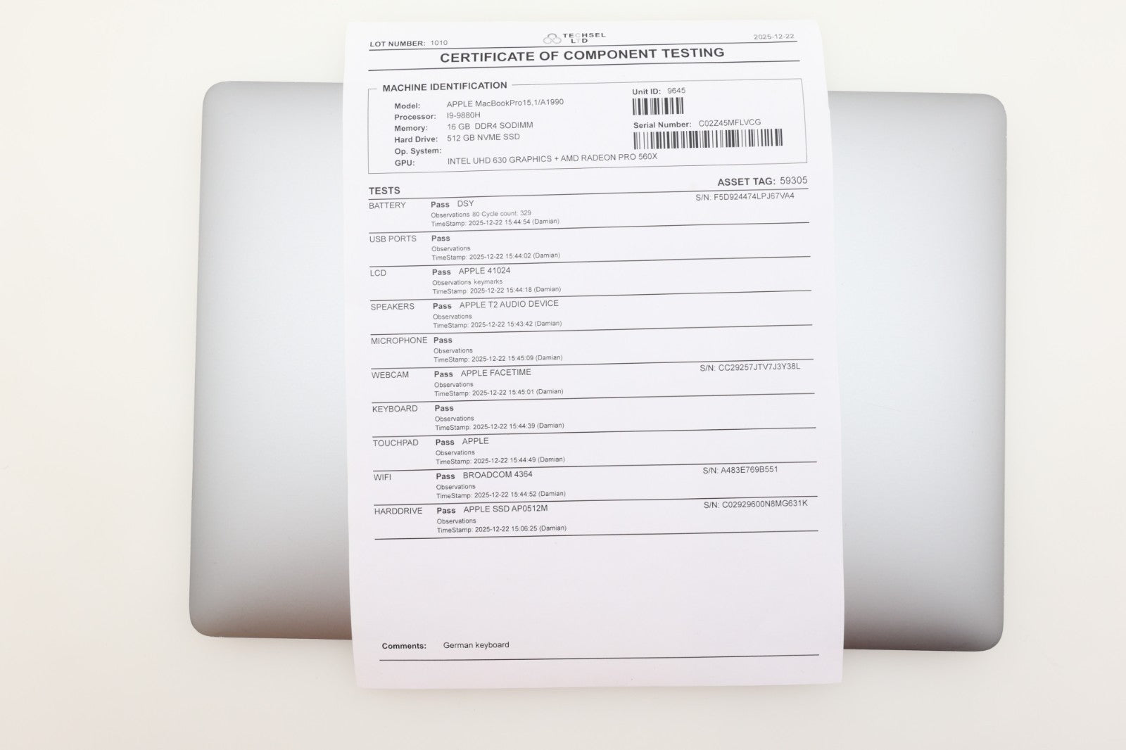 Model: Apple MacBook Pro 15.4" (2019 β A1990)
