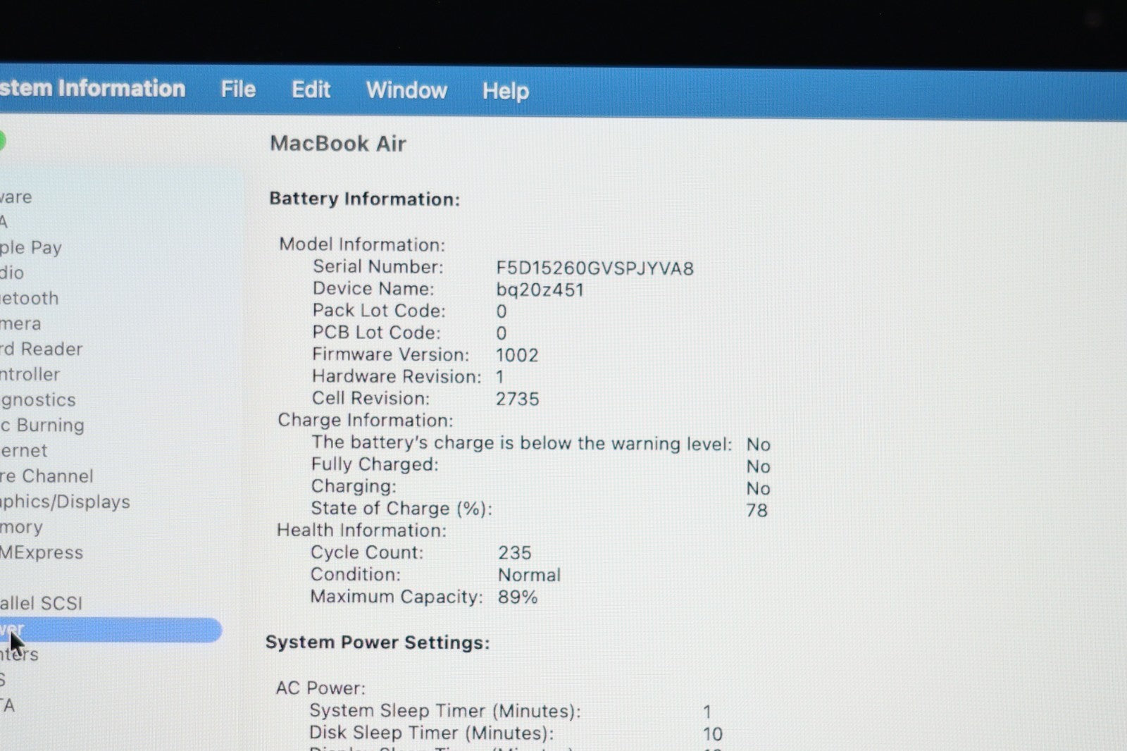 Battery Health: 89% Maximum Capacity β 235 Charge Cycles π