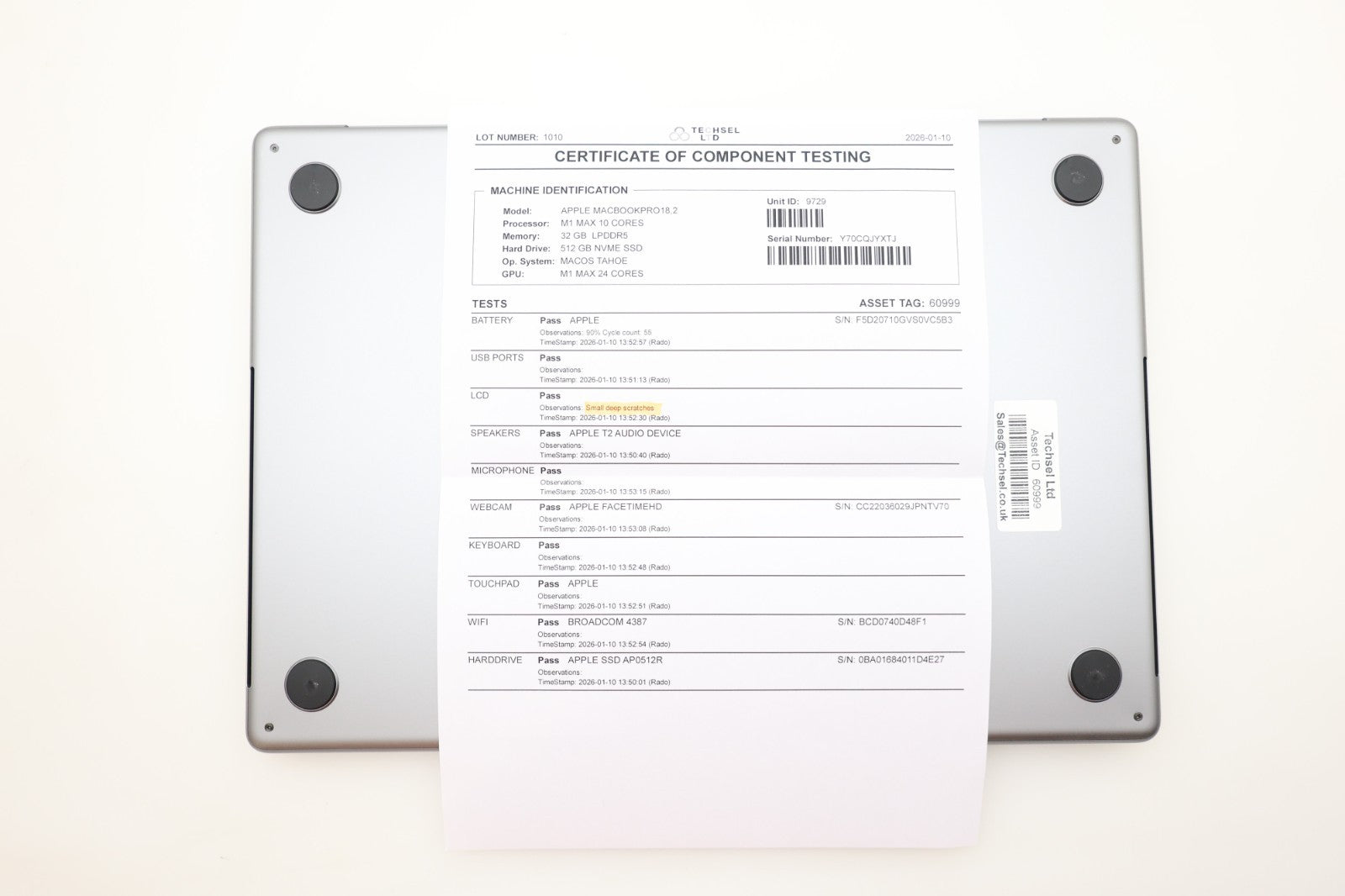 This MacBook is in Good overall condition (Grade B+). It will have a few very small, superficial scratches on the body, which are minor and purely cosmetic. The LCD has one pin-sized deeper scratch that may be slightly noticeable when the screen is on, depending on lighting and background. Aside from this, the device functions perfectly and performs exactly as it should. Please refer to the photos for full details of the cosmetic condition.